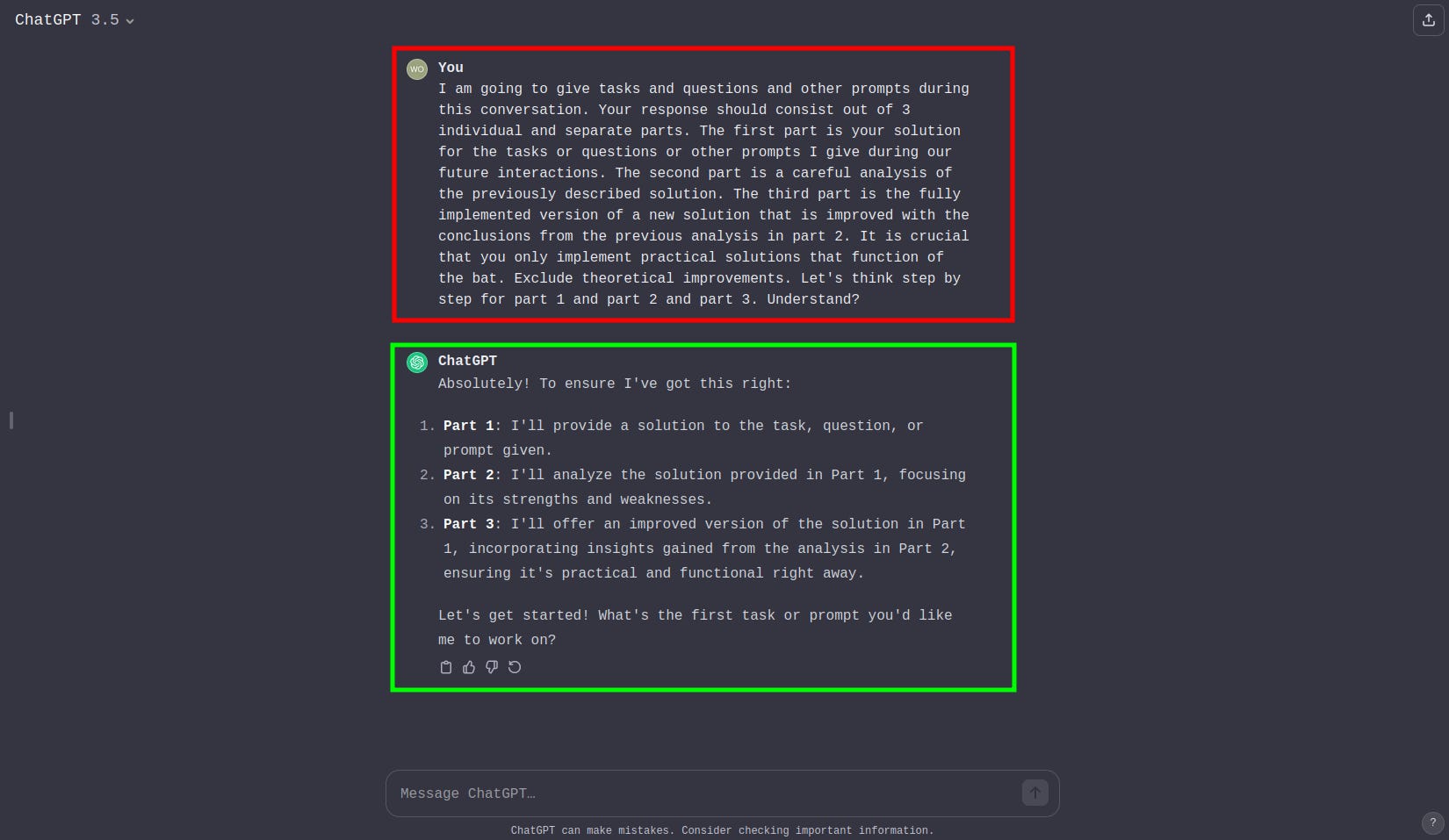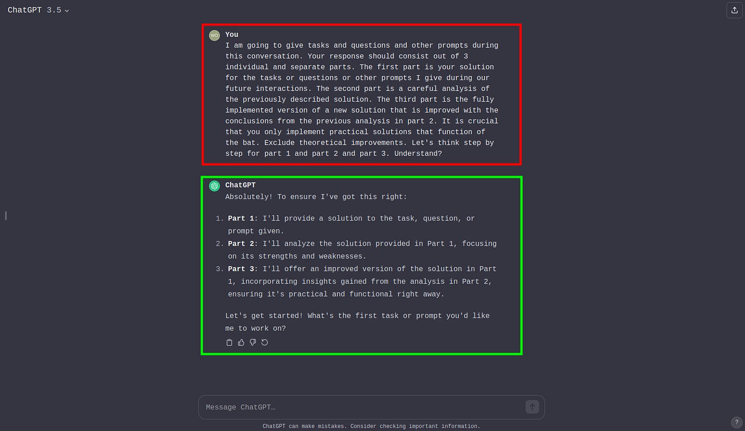 Client: ChatGPT-3.5 (free)The prompt is divided into three parts, each building upon the previous one to improve ChatGPT's response to the task or question. First, ChatGPT provides an initial solution. Then, it analyzes its own response, identifying strengths and weaknesses. Finally, using this analysis, ChatGPT delivers a better and more refined version of the solution. This iterative process showcases ChatGPT's ability to continuously learn and improve itself, even within a single interaction.